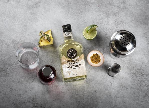 Pour 40 ml of Genepi Meunier Altitude, 80 ml of fresh pineapple juice, 1/4 squeezed lime and 1/2 passion fruit into a shaker.